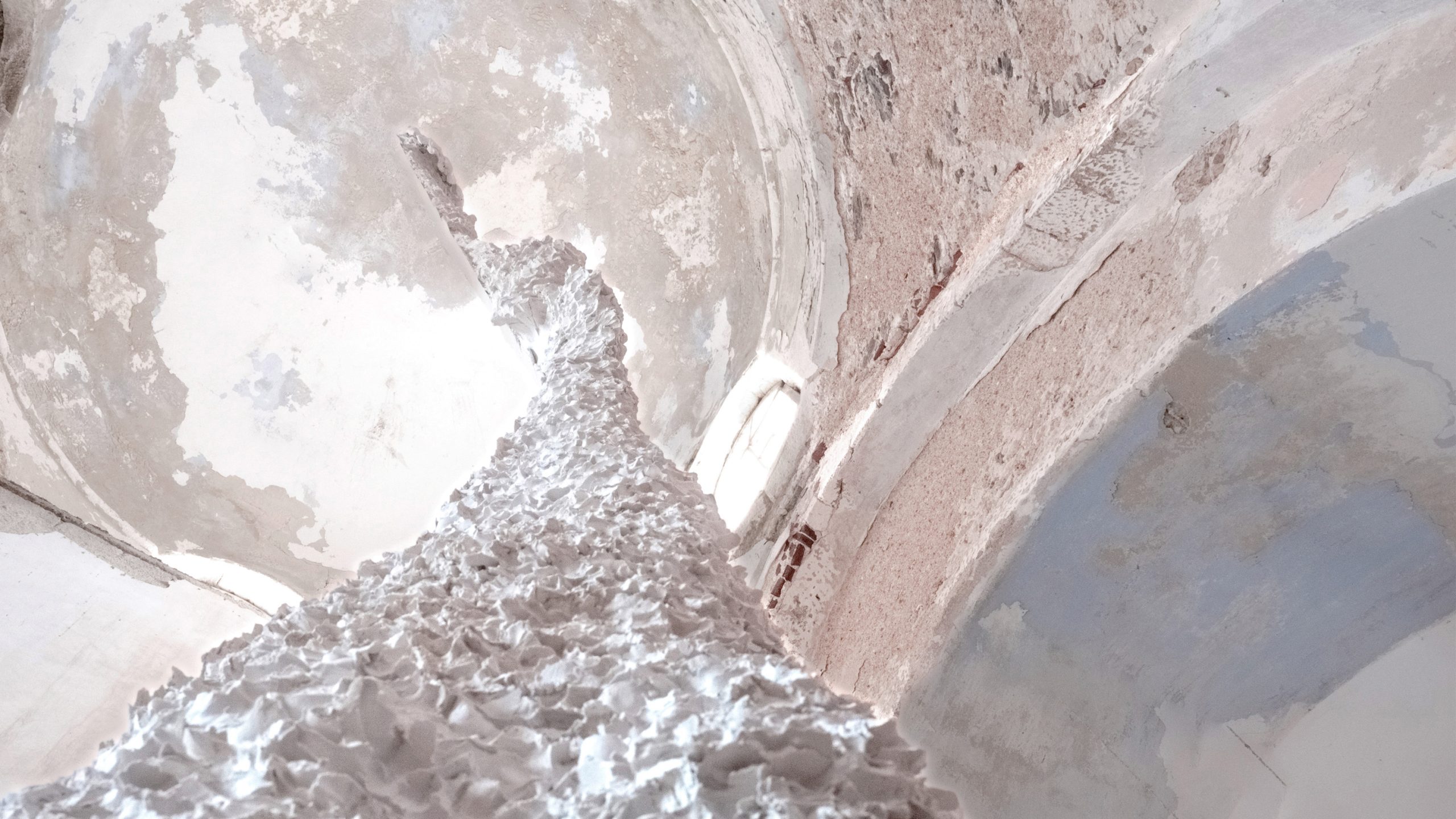 Ank’s frescoes navigate a finely tuned balance between painting and sculpture. The process is guided by questions such as: How much or how little volume can a sculpture occupy before it ceases to be spatial? To what extent can sculpture become pure surface, and can surface itself give rise to space? Where does surface end and space begin?